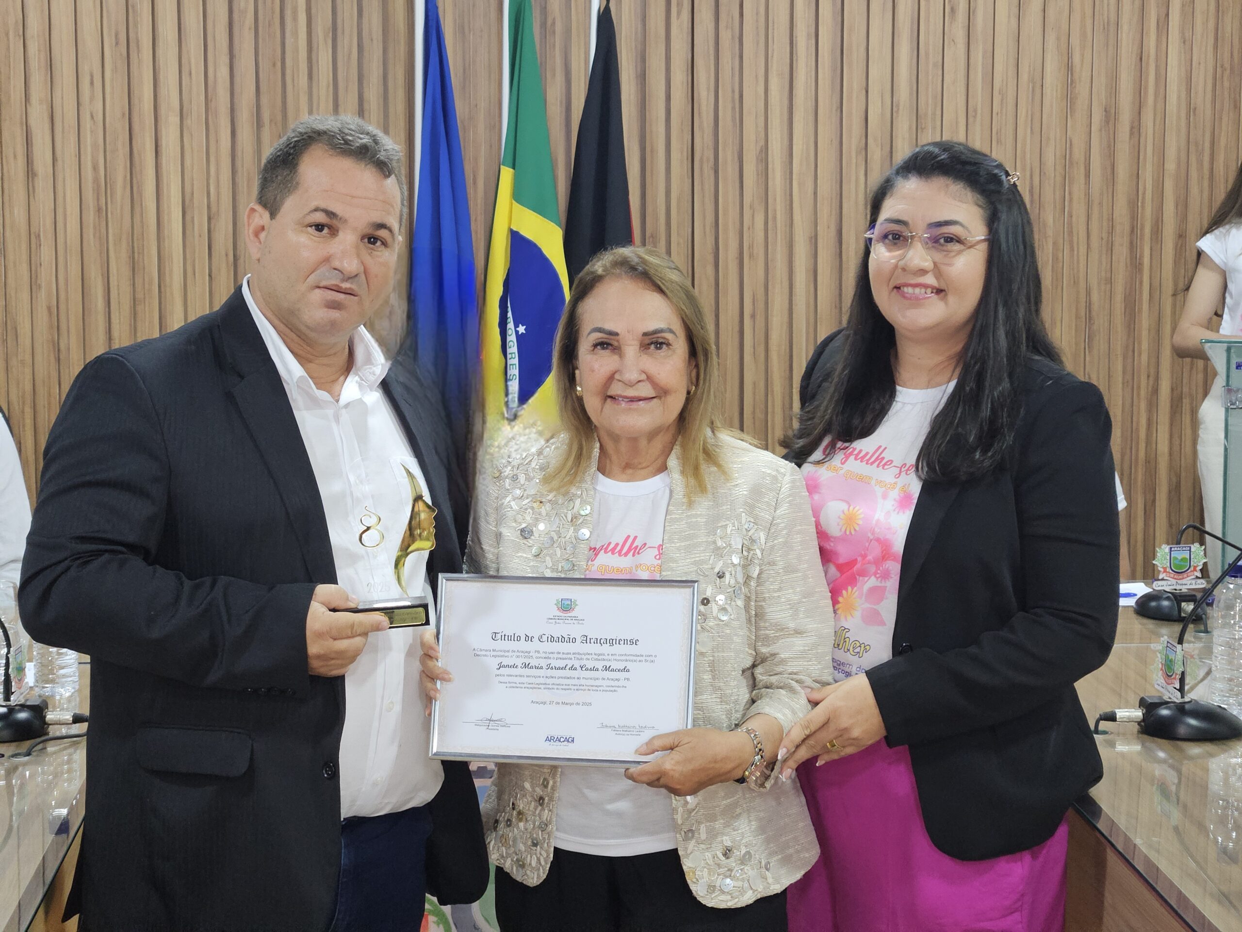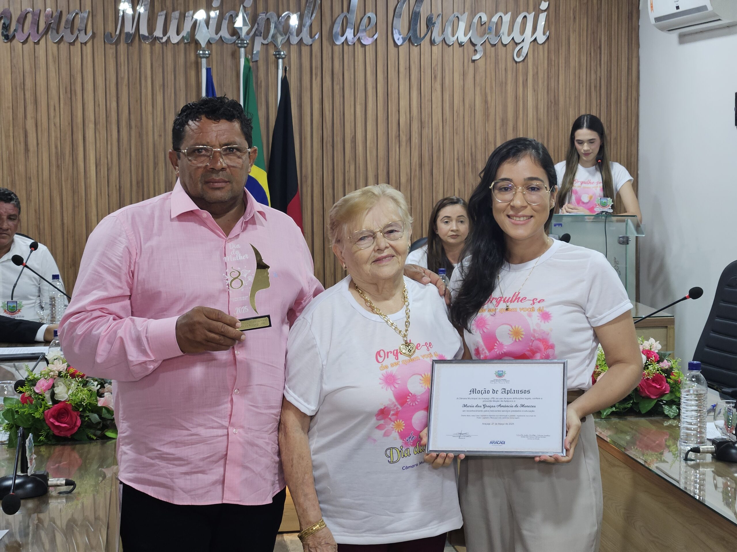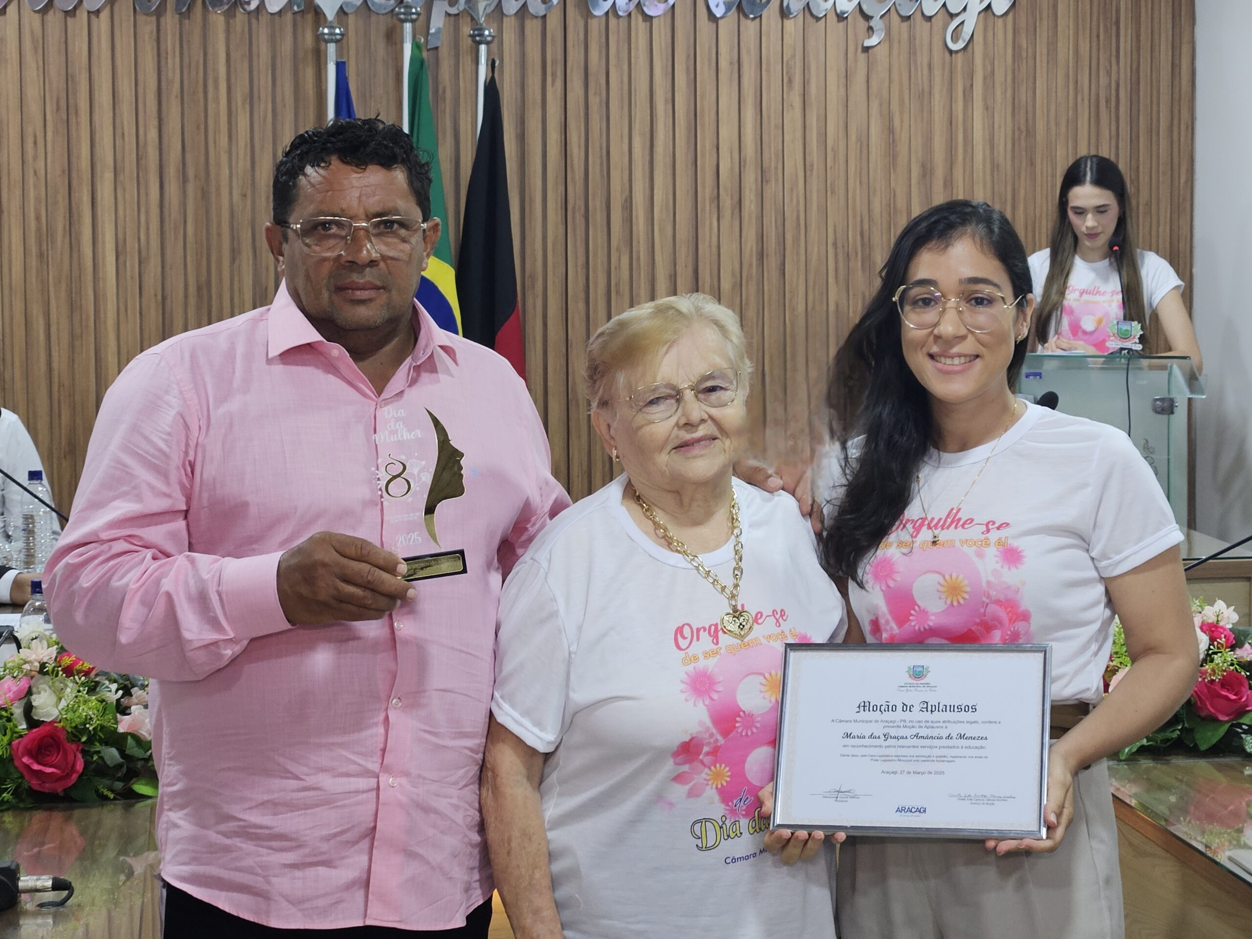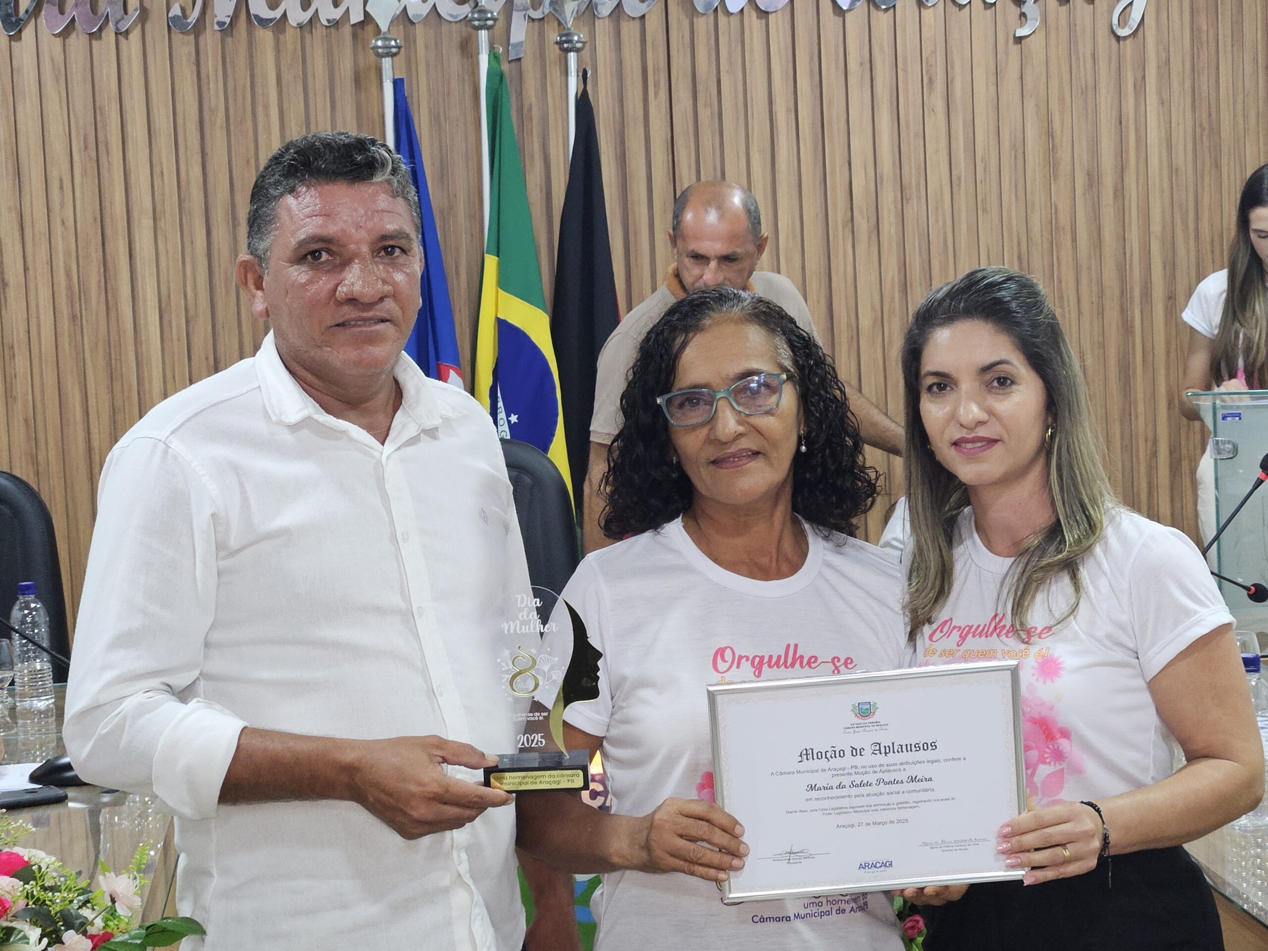 Diversas autoridades estiveram presentes, incluindo a Secretária de Ação Social, Danielly Pessoa, e representantes da assistência social e educação. Um dos momentos mais marcantes foi a entrega de honrarias a mulheres que se destacaram em diferentes setores. Entre as homenageadas estavam Janete Maria Israel da Costa Macedo (Título de Cidadã Honorária de Araçagi), Sônia Maria Leite de Oliveira (Moção de Louvor na saúde pública), Severina Gomes Barbosa (Moção de Louvor pela dedicação à família e educação), Ana Paula Régis da Silva (Moção de Aplausos na cultura e artesanato), Ana Kelly Nunes Bezerra (Moção de Aplausos na inclusão e acessibilidade), Maria Salustiano Duarte de Souza (Moção de Aplausos pelos 40 anos na educação), entre outras personalidades reconhecidas por suas contribuições à comunidade.