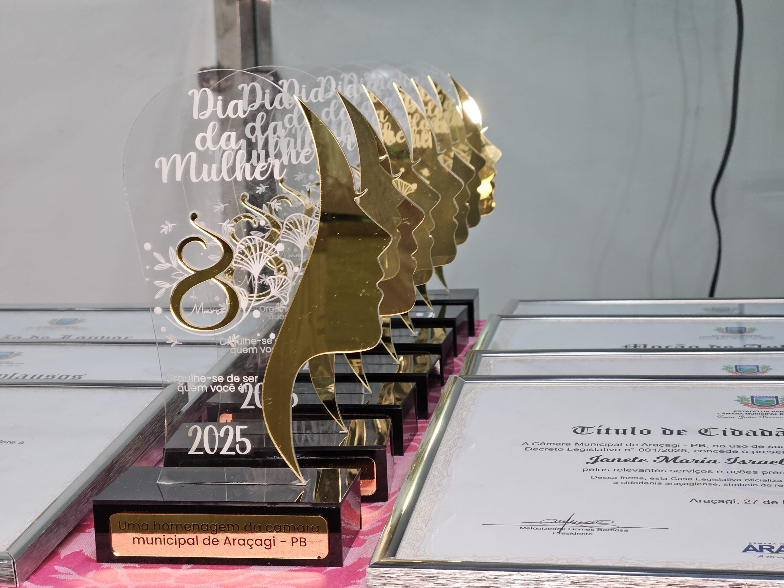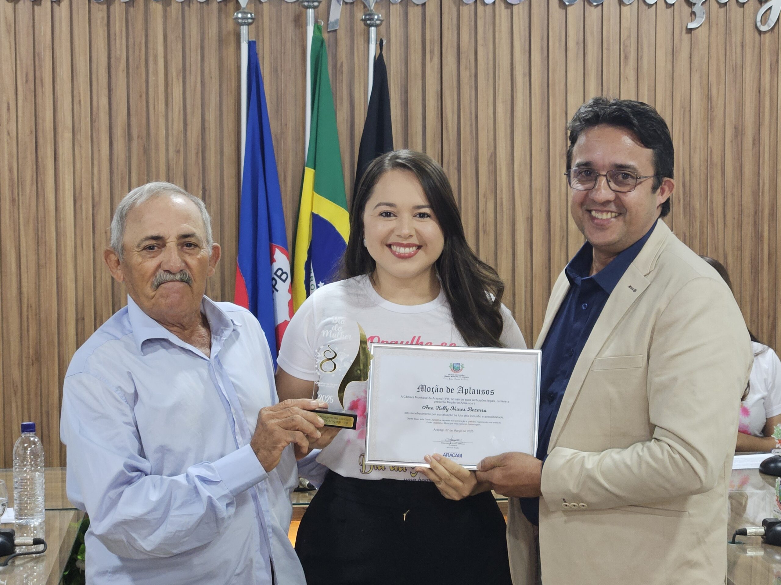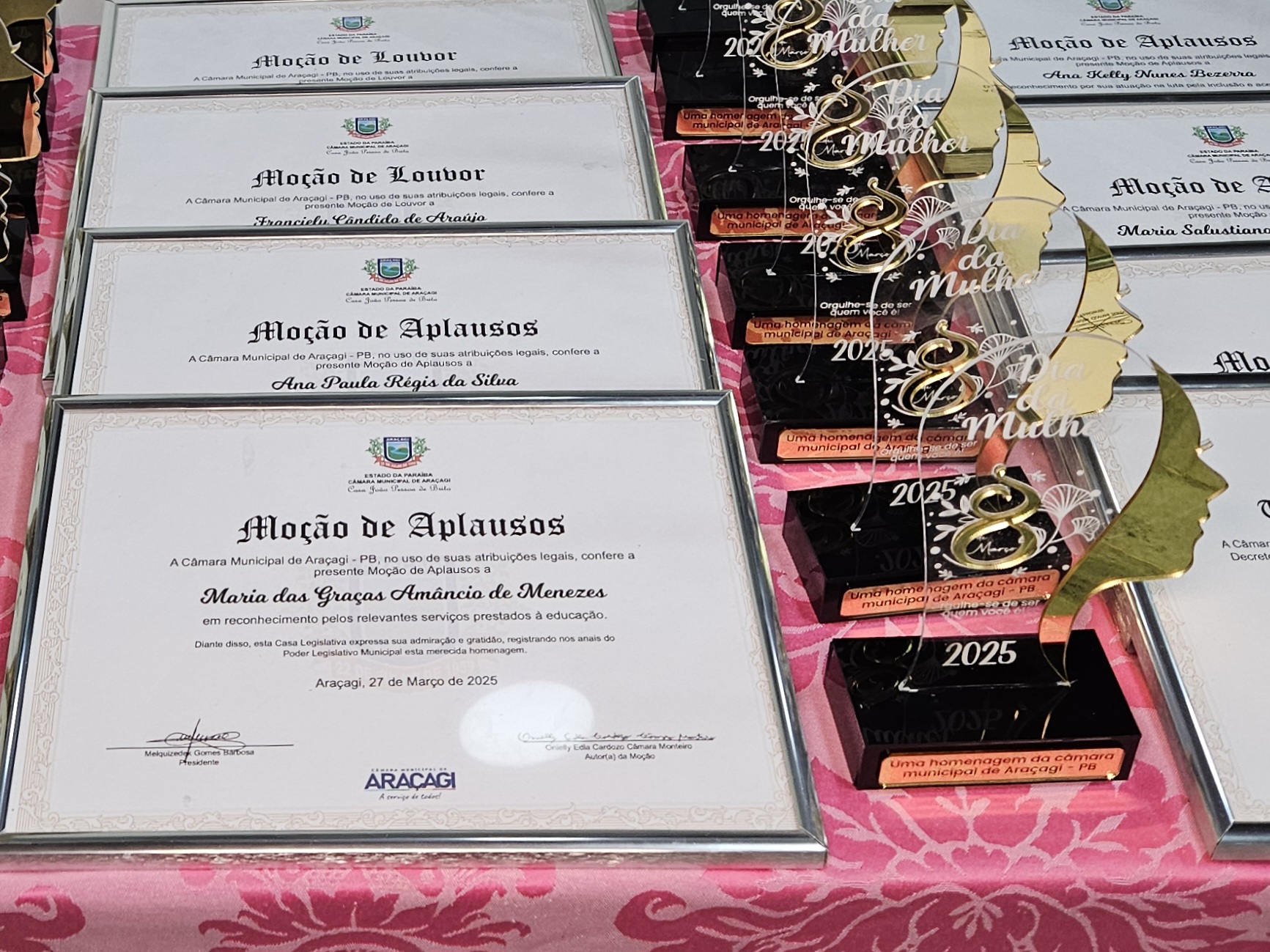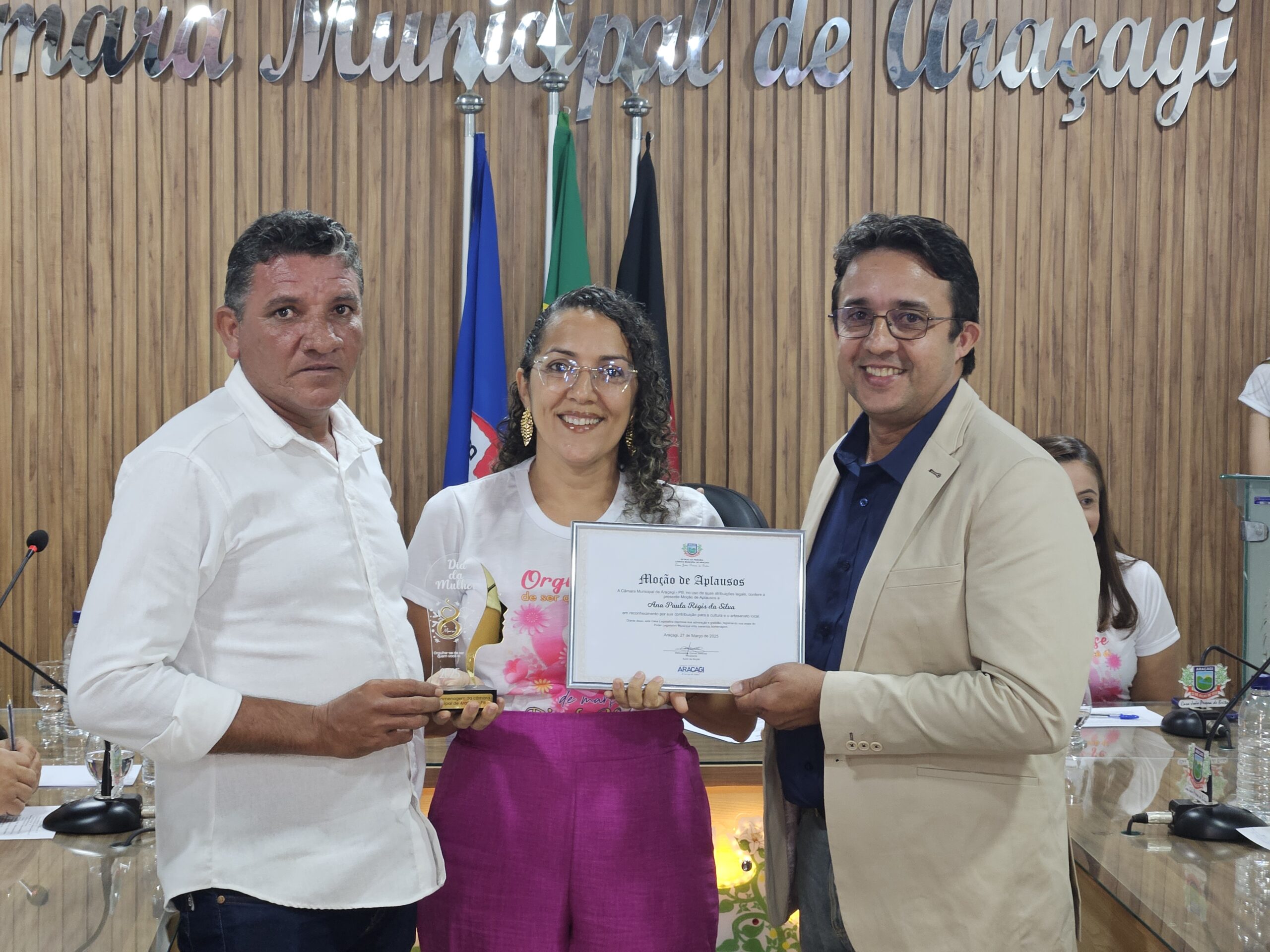 Diversas autoridades estiveram presentes, incluindo a Secretária de Ação Social, Danielly Pessoa, e representantes da assistência social e educação. Um dos momentos mais marcantes foi a entrega de honrarias a mulheres que se destacaram em diferentes setores. Entre as homenageadas estavam Janete Maria Israel da Costa Macedo (Título de Cidadã Honorária de Araçagi), Sônia Maria Leite de Oliveira (Moção de Louvor na saúde pública), Severina Gomes Barbosa (Moção de Louvor pela dedicação à família e educação), Ana Paula Régis da Silva (Moção de Aplausos na cultura e artesanato), Ana Kelly Nunes Bezerra (Moção de Aplausos na inclusão e acessibilidade), Maria Salustiano Duarte de Souza (Moção de Aplausos pelos 40 anos na educação), entre outras personalidades reconhecidas por suas contribuições à comunidade.